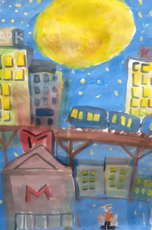 Композиция на заданную тему к конкурсу «Мой район». Формат работы А2, техника «гуашь», бумага. Илья изобразил индустриальный район Кузьминки города Москвы. Здесь у нас и автострада, и метро, и большие дома, и яркая большая луна на ночном небе!