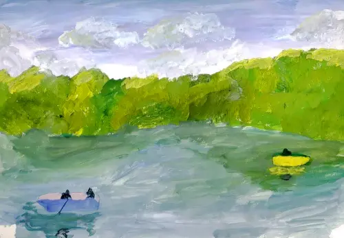 Лодочная станция в исторической усадьбе Влахернского в Кузьминках. Живописный этюд. Прогулка на лодочках в тени ветвистых деревьев. Работа формата А3, техника «акрил»
