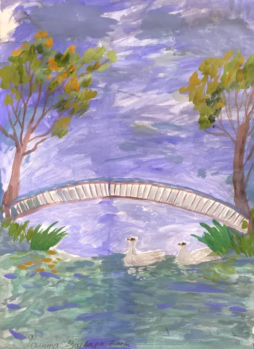 На работе изображён мостик через пруд в парке Кузьминки. В этом тихом месте грациозно и медленно плывут лебеди. Спокойная, умиротворённая композиция юного художника Вари. Формат А2 техника «гуашь».