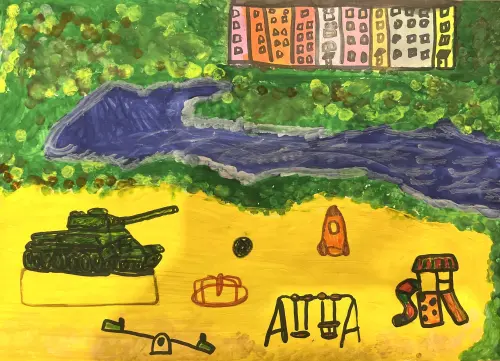 Маша нарисовала свой район Строгино глазами ребёнка. В нем расположились много детских площадок, залив, на котором она часто гуляет. Красивые радужные дома.