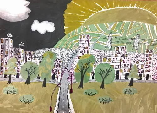 Работа выполнена в графике с использованием маркеров и металлических фломастеров. Вид на город на рассвете с его многоэтажками, электровышками, деревьями и дорогами.