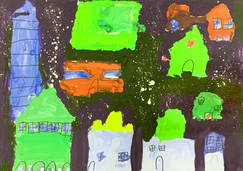 Я живу в районе Чертаново. И нарисовал дома ночью. Они разноцветные. Выпал первый снег. Все люди спят. На улице никого нет. Тишина наступает. Птицы тоже заснули.