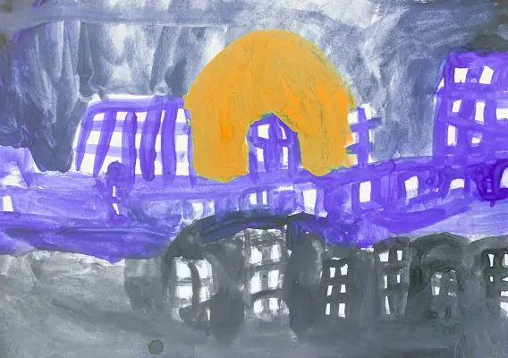 Я живу в районе Чертаново. И нарисовал наш район ночью. Дома отражаются в лужах после дождя. Видно свет возле ночного магазина. Он тоже отражается в лужах.