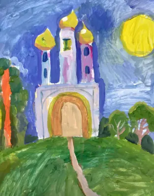 Работа выполнена на тему «Мой район». На работе изображён небольшой храм, освещённый ярким светом рано утром. Солнышко ярко сияет в его золотых куполах. Станковая работа, формат А2, техника «гуашь».