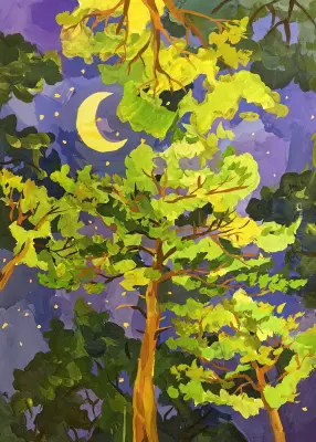 Я выхожу гулять с собакой поздно вечером. На небе месяц и звёзды. Мой район очень красив в любое время года. Сейчас цветут липы и воздух пахнет медовой свежестью