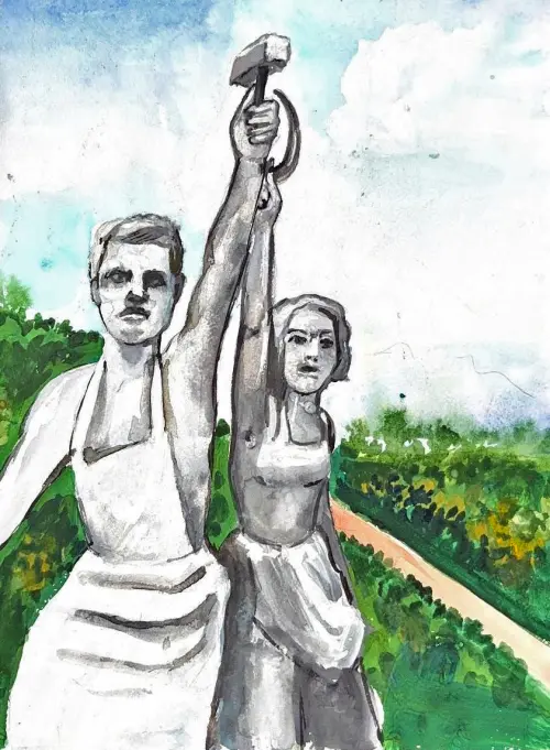 Работа выполнена в технике акварель. На ней изображена всем известная скульптура «Рабочий и колхозница». Она находится неподалёку от северного входа ВДНХ