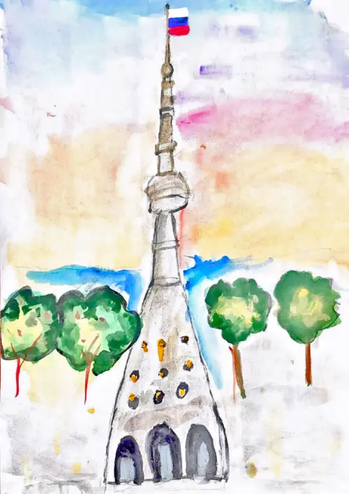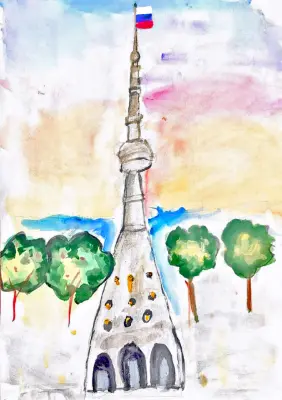 Рисунок выполнен акварельными красками. Изображена Останкинская телебашня и деревья в закате. Нежные цвета заката подчёркивают сочную зелень деревьев около башни