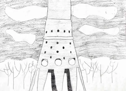 Рисунок выполнен карандашом. Изображена Останкинская телебашня с деревьями в неявную погоду. Из-за схематичного изображения башня напоминает инопланетный корабль