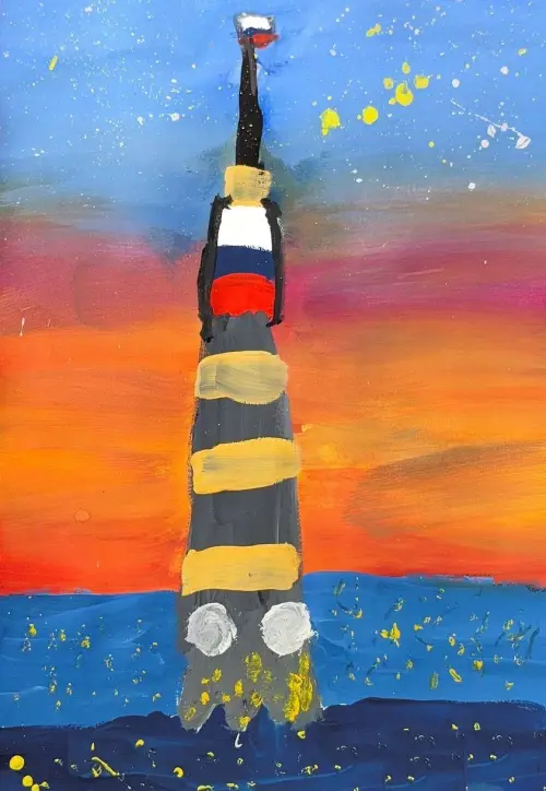 Рисунок выполнен акварельными красками. Изображена Останкинская телебашня на закате. Над верхушкой башни реет российский флаг и летают хвостатые кометы