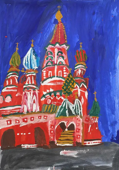 Московский храм Василия Блаженного, наравне с Кремлём, ассоциируется с одним из главных символов столицы. Многовековая история его создания и существования насыщена массой ярких и одновременно таинственных событий и фактов, подробности которых неизвестны и сегодня. Рисунок выполнен в технике гуашь.