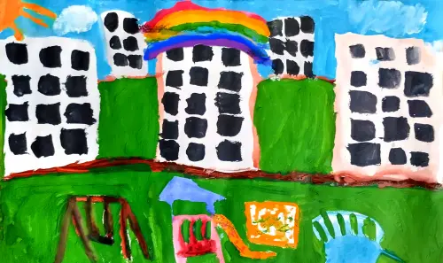 Я нарисовала свой двор. Мне он очень нравится. В нем есть всё, что нужно для развлечений. Я очень люблю гулять во дворе со своими друзьями. Мы играем в футбол, катаемся на качелях. Мой двор самый лучший