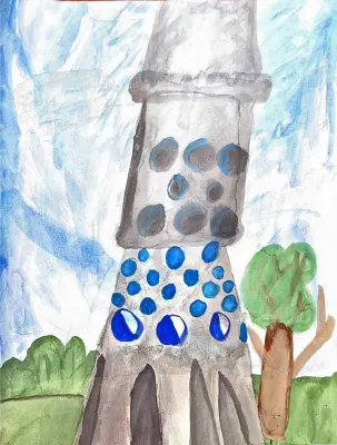 Рисунок выполнен акварельными красками. На заднем фоне Останкинской телебашни изображён парк. Тёплый, летний день, трава и деревья зелёные, а небо голубое