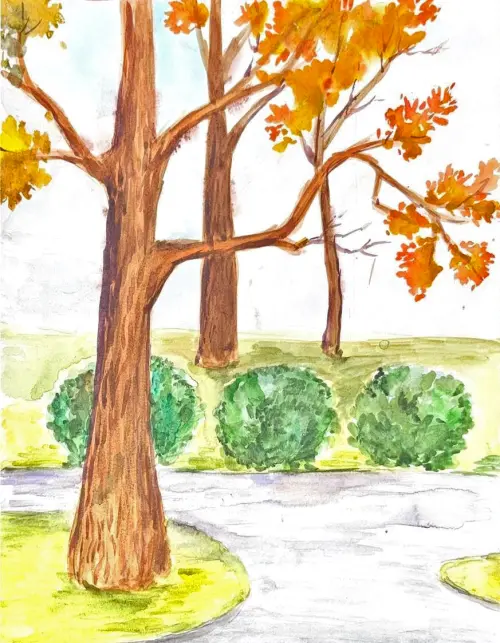 Рисунок выполнен акварельными красками. Осенняя пора в Останкинском парке: пожелтевшие дубы и трава, зеленоватые кусты самшита и тяжёлое осеннее небо.