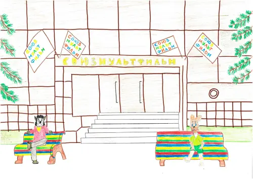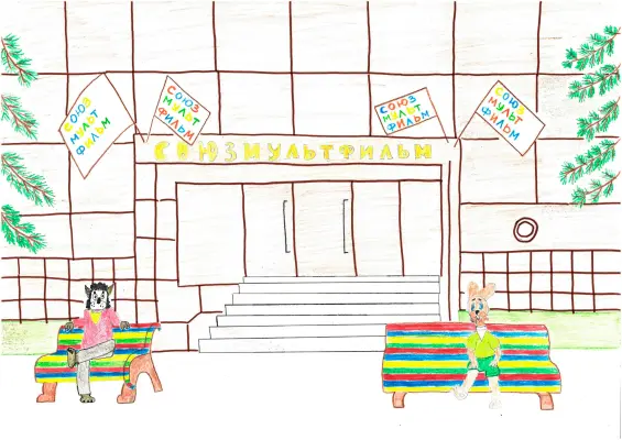 На изображении представлена иллюстрация здания киностудии «Союзмультфильм». На переднем плане — скамейки, на которых сидят два известных персонажа: Волк и Заяц из мультфильма «Ну, погоди!». Они изображены в расслабленной позе, как будто отдыхают перед студией.