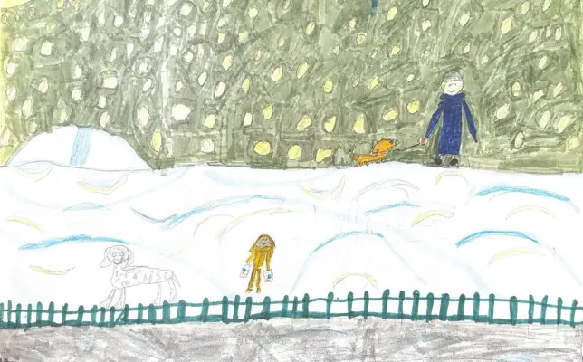 Рисунок выполнен акварельными красками, карандашом и фломастерами. Зимние прогулки собачников по любимому Звёздному бульвару — им никакой холод не помеха!