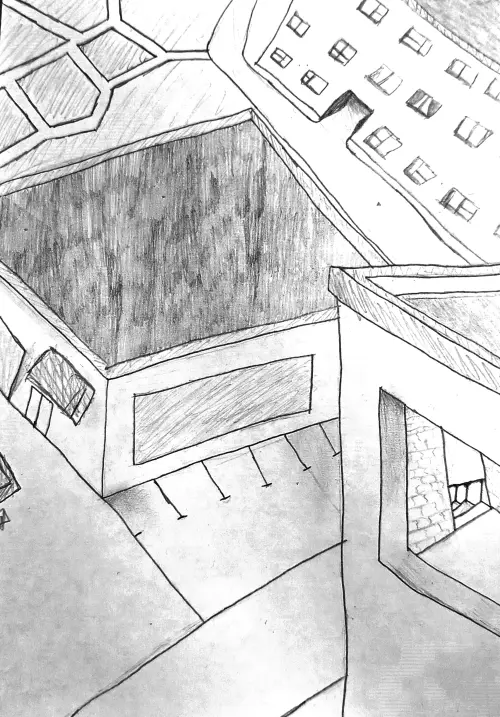 Перекрёсток по адресу Римского-Корсакова 20, нарисованный моими руками. Нарисован простым карандашом. Соотношение с реальной улицей немного не совпадает.