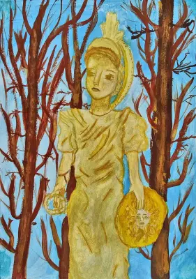 Я изобразила на своей картине фигуру античной статуи, которая находится в моём любимом парке Царицыно. На голове у неё золотой шлем, в руке – щит, что указывает на воинственное предназначение данной скульптуры. Мне очень нравятся античные статуи. После того как я прочитала «Мифы Древней Греции», мне очень захотелось нарисовать какую-нибудь богиню. Однажды, прогуливаясь в глубине парка Царицыно, я увидела несколько статуй, украшающих ландшафт.