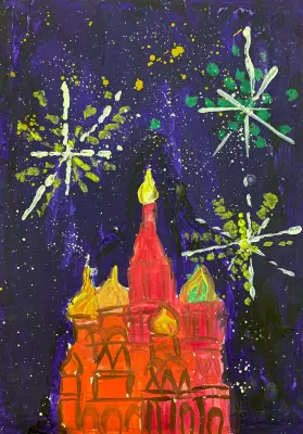 Я живу в Чертаново. На рисунке - салют на Красной площади. На Красной площади есть Храм Василия Блаженного. Небо становится очень красивым во время салюта.