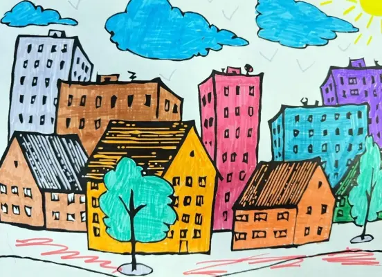 Я так вижу свой любимый район. На картине изображены уютные дома, расположенные вдоль живописной улицы. Каждый дом имеет свою уникальную архитектуру. Вокруг домов раскинулись зелёные деревья и цветущие кустарники, создавая атмосферу уюта и спокойствия. Всё это создает ощущение гармонии и тепла, как будто каждый дом хранит свою историю и радушно встречает гостей.