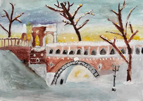 Я нарисовала Фигурный мост в Царицыно зимой. Красный кирпичный мост, словно покрытый пушистым белым одеялом снега, величественно раскинулся над замёрзшей водой. Голые деревья, украшенные лёгким снежным инеем, окружают мост, словно стая застывших птиц. Небо сдержанно-серое, но пробивающиеся сквозь тучи лучи солнца оживляют картину тёплыми золотыми бликами. Это моя самая любимая зимняя картина!