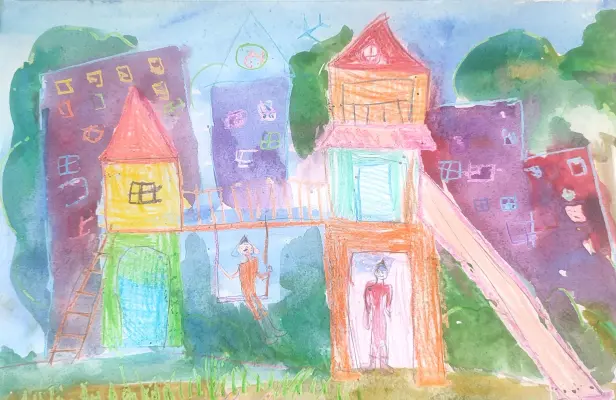 Детский городок в моём дворе - самое красивое и радостное место для меня. Там есть всё: и горка, и качели, и песочница. Много детей с родителями и всем весело.