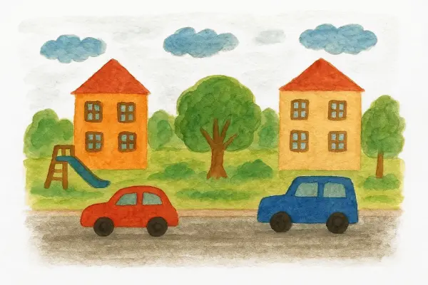 Я нарисовал несколько маленьких машинок, которые стоят на тротуаре в моём районе. Я хотел показать, как я часто прохожу мимо них, когда гуляю. Мне кажется, эти машинки напоминают мне о детстве. Вокруг — дома, деревья, детские площадки. Мне нравится, что эти машинки делают мой район немного ярче и веселее. Этот район — часть моей жизни, и я хотел показать, как я его вижу.