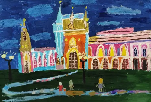 Я часто гуляю со своей семьёй в парке Царицыно. Больше всего мне нравится, как он светится по вечерам. Вот это Большой дворец – такой яркий, словно сказка! Я старалась передать, как красиво играет свет на его стенах. Оранжевый, красный, золотой - настоящая магия! Розовато-лиловые цвета, как будто закат, отражаются в окнах. Я очень старалась, чтобы моя картина передала всю красоту вечернего парка Царицыно.