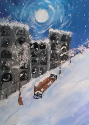 На рисунке изображён московский дворик зимним вечером. Работа выполнена красками. Ребёнок очень любит рисовать, он очень старался. Рады участвовать в конкурсе.