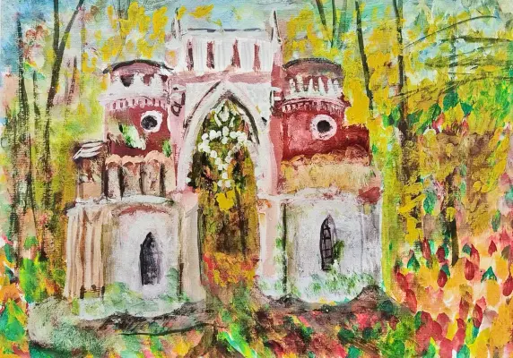 Мой рисунок изображает фигурные ворота Царицынского парка, те самые, что издавна зовут «виноградными». Изящный белокаменный узор, словно застывшая виноградная лоза, распускается на их поверхности, придавая воротам неповторимое очарование. Дополняет красоту архитектуры осенний лес. Это гармоничное сочетание архитектуры и природы создаёт на рисунке особую атмосферу спокойствия и красоты.