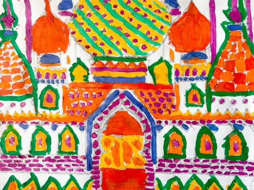 На картине изображен Собор Покрова Пресвятой Богородицы на Рву. Собор является одним из самых известных символов Москвы. Отличается своей уникальной архитектурой
