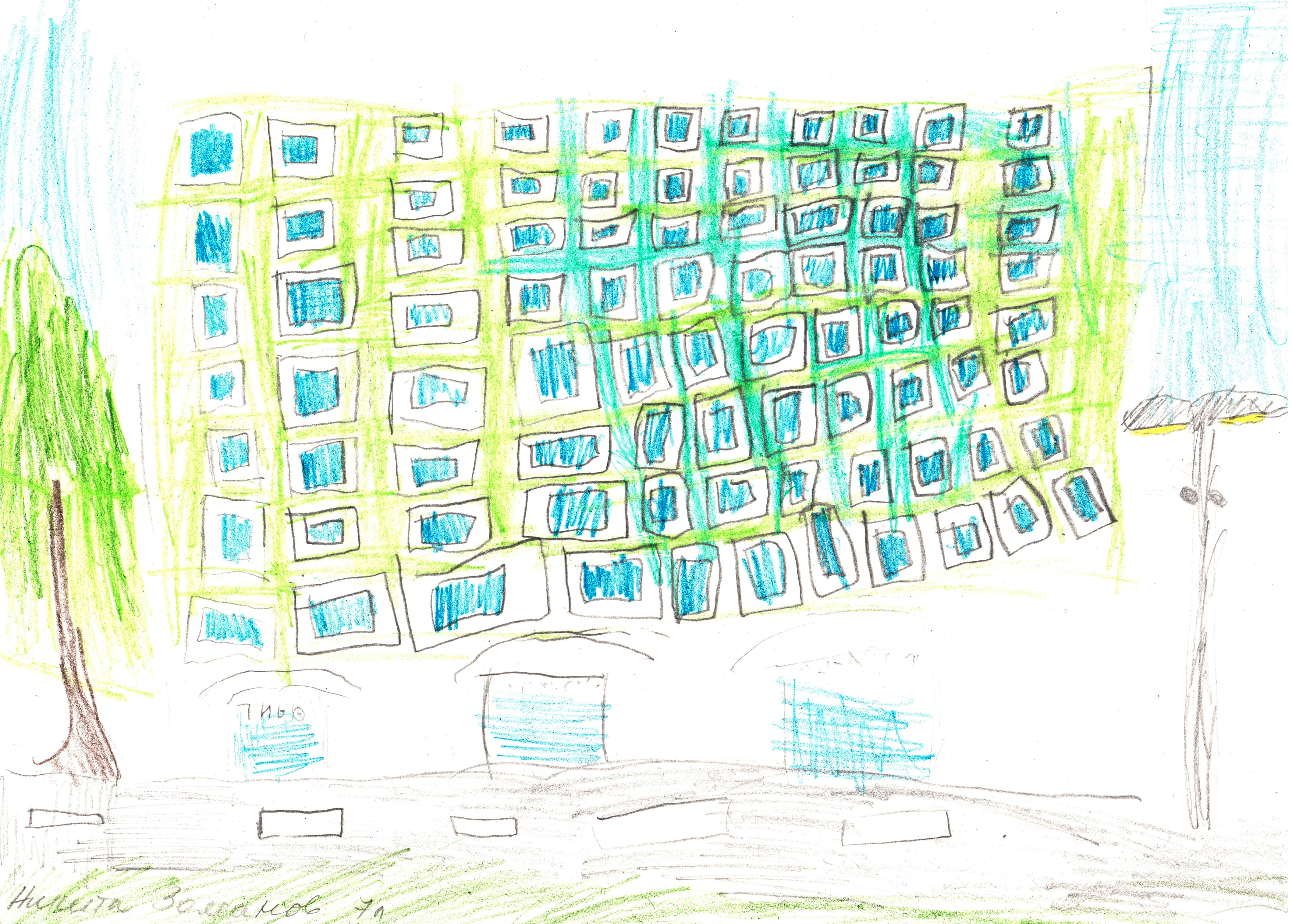 «На рисунке изображен дом, в котором живу я и моя семья, а также друзья. Возле нашего дома есть очень хорошая детская площадка на которой много горок и качелей. Я люблю гулять там с братом и друзьями»