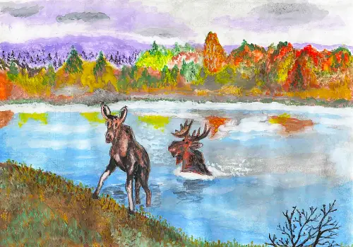 Я живу в районе Лосиноостровский,и очень часто гуляю с родителями в парке «Торфянка». Я нарисовала символ района - Лося и его подружек, которые купались в пруду