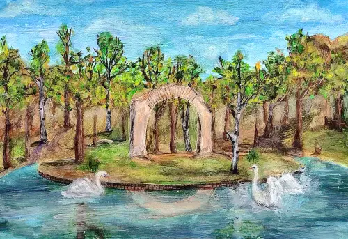 Каждый посетитель парка задается вопросом: что это за остров посреди Царицынского пруда? Это одна из загадок нашего парка. По легенде, русалки каждую ночь выбирались на берег и пели серенады уставшим путникам. Тот, кто поддастся их чарам, будет навечно унесен в пучину воды. И я решила изобразить на своей картине тот самый Русалкин остров и Русалочьи ворота. Пейзаж в этом месте очень живописен. Я очень горда тем, что такие достопримечательности есть в моем районе.
