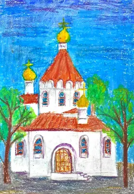 Храм - настоящий уголок тишины и умиротворения. Здесь как-то особенно ощущаешь покой и благодать. Архитектура храма впечатляющая. Рисунок выполнен на первом пленэре ребёнка