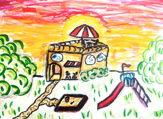 Дом культуры, который в будущем будет в моём районе: с прогулочной верандой на крыше и детской площадкой перед ним. Работа выполнена простым карандашом, раскрашена фломастерами и цветными карандашами.