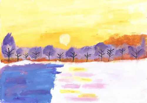 На этом рисунке я изобразила момент заката в парке Лианозово. Небо окутано тёплыми оттенками оранжевого, розового и пурпурного, плавно переходящими друг в друга, создавая ощущение спокойствия и гармонии. Солнце медленно опускается за горизонт, его последние лучи окрашивают облака в золотисто-розовые тона, придавая пейзажу особую магию