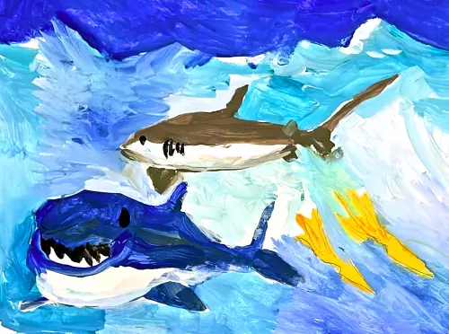 На картинке изображены две больших акулы, которые плавают в океане. Они выглядят очень грозно и интересно. Один из них, кажется, больше и темнее, а другая - светлее и меньше.