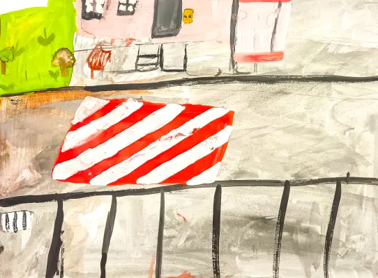 Такие разметки есть практически возле каждого дома в городе. Мне захотелось нарисовать эту обычную и, казалось бы, неприметную деталь в нашем дворе. Все проходят мимо и не замечают её. А ведь я не раз замечала, как на этих разметках паркуют свои автомобили жильцы, хотя этого делать категорически нельзя, ведь в случае беды пожарные или скорая не смогут встать на отведённое им место