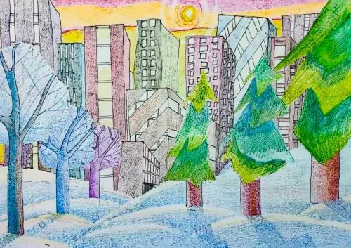 Вид из моего окна. За стеклом морозным утром просыпается любимый район. Улицы укрыты пушистым снегом. Все наслаждаются тишиной и красотой просыпающегося города. Работа выполнена акварельными карандашами.