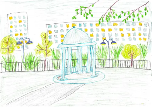 На рисунке я изобразил моё самое любимое место - микрорайон Северное Чертаново. Там много интересных мест для прогулок всей семьёй. Из ротонды открывается прекрасный вид на Верхний Чертановский пруд и высотные дома микрорайона. А ещё в микрорайоне любят снимать кино и телепередачи известные режиссеры.