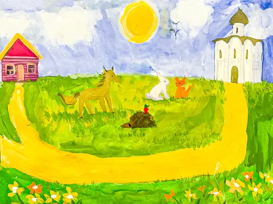 У нас в районе есть Храм Серафима Саровского. Он белый с золотыми куполами. Напоминает мне Храм в деревне, где живет моя бабушка. Поэтому я дорисовала ее домик.