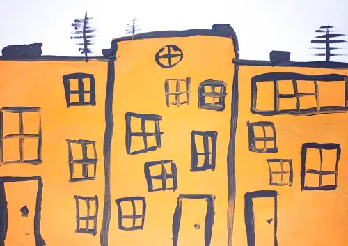 На картинке изображён мой дом. Он большой и жёлтый, с множеством окон. На крыше нарисованы антенны, а рядом с домом растут деревья. Я очень люблю свой дом и свой район.