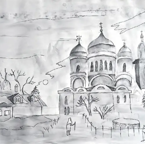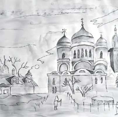 Я нарисовала Храм Николая Чудотворца, который находится в моем районе Бирюлево Западное. Совсем раньше там стояла только деревянная церковь, а совсем недавно был построен и открыт величественный каменный храм.