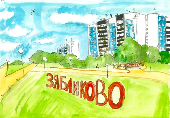 Я обожаю наш район! Очень люблю гулять по нему как в летнее время, так и в зимнее! Однажды, гуляя с друзьями, я увидела большую надпись с названием нашего района. Мне очень захотелось выразить это на бумаге!