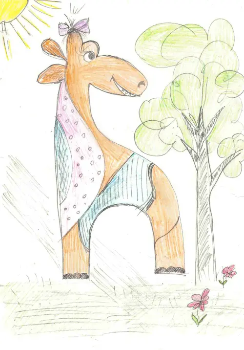 Такой жирафик у нас во дворе. Еще совсем маленькой по дороге в детский сад, я останавливалась и разговаривала с ним, разглядывала, гладила. Сейчас я большая, но жирафика люблю до сих пор.