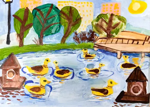 Я рисовал семейство птиц, уток-мандаринок, за которыми люблю наблюдать и угощать капустой и перловой, в парке Торфянка. А порой они прилетают на крышу соседнего дома, и я вижу их из окошка, так и живём дружно, по соседству.