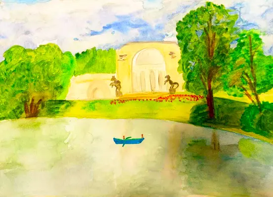 Я очень люблю Кузьминский лесопарк. Недалеко от него живут мои бабушки Наталья и Людмила. Мама с папой часто возят меня к ним в гости в Кузьминки. С самого детства я ездил на Новый год в усадьбу Деда Мороза, катался со знаменитых Кузьминских горок на санках и ватрушках и на лыжах с родителями. Очень часто на плотине мы кормили диких уточек, летом смотрели фестиваль цветников, катались на пароме, посещали Кузьминский зоопарк с белочками и другими зверушками. Мы часто брали с собой капусту, морковку и кормили там этих зверей. Во Влахернской церкви меня крестили, а мама моя работала непосредственно в усадьбе Голицыных, когда здание принадлежало Институту ветеринарии, а храма ещё не было. Я изобразил пруд и фасад конюшенного двора. В 90-е годы там был гараж, где работал мой дедушка. Лошадей ещё не было, их позже восстановили. Это очень красивый вид: виден летний пруд, недалеко лодочная станция, а в лодке катаюсь я со своим папой.