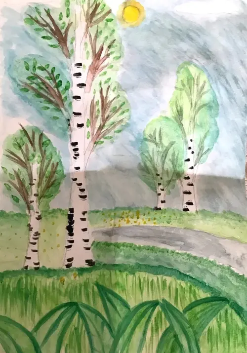 Это мой район, где я люблю гулять и играть каждый день! Вот деревья, которые растут вдоль дороги. Они такие высокие и красивые, с белыми стволами и зелёными листьями. Я часто гуляю под ними, когда иду в школу или просто играю с друзьями.