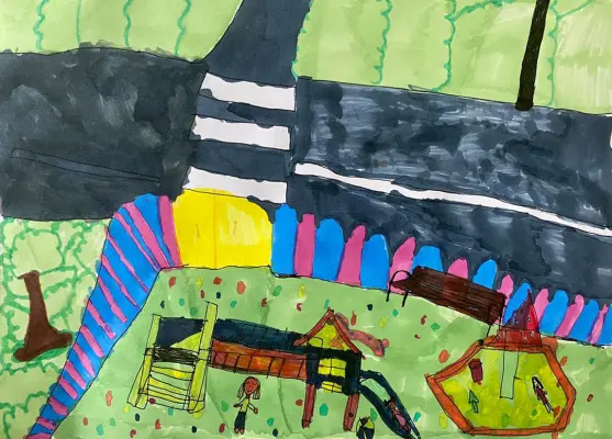 На этой картине изображен, мой любимый и родной район, на котором я очень люблю гулять со своими друзьями!!! На этой картинке я нарисовала маму и себя, ведь мы очень часто тут бываем.Еще на рисунке есть дорога, по которой катается очень много машин.