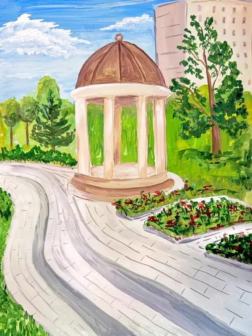 На работе, выполненной учащейся подготовительной группы, изображена одна из достопримечательностей города Зеленоград. Работа выполнена гуашью. На работе автор хотела показать, как красиво в парковой зоне одного из районов Зеленограда.